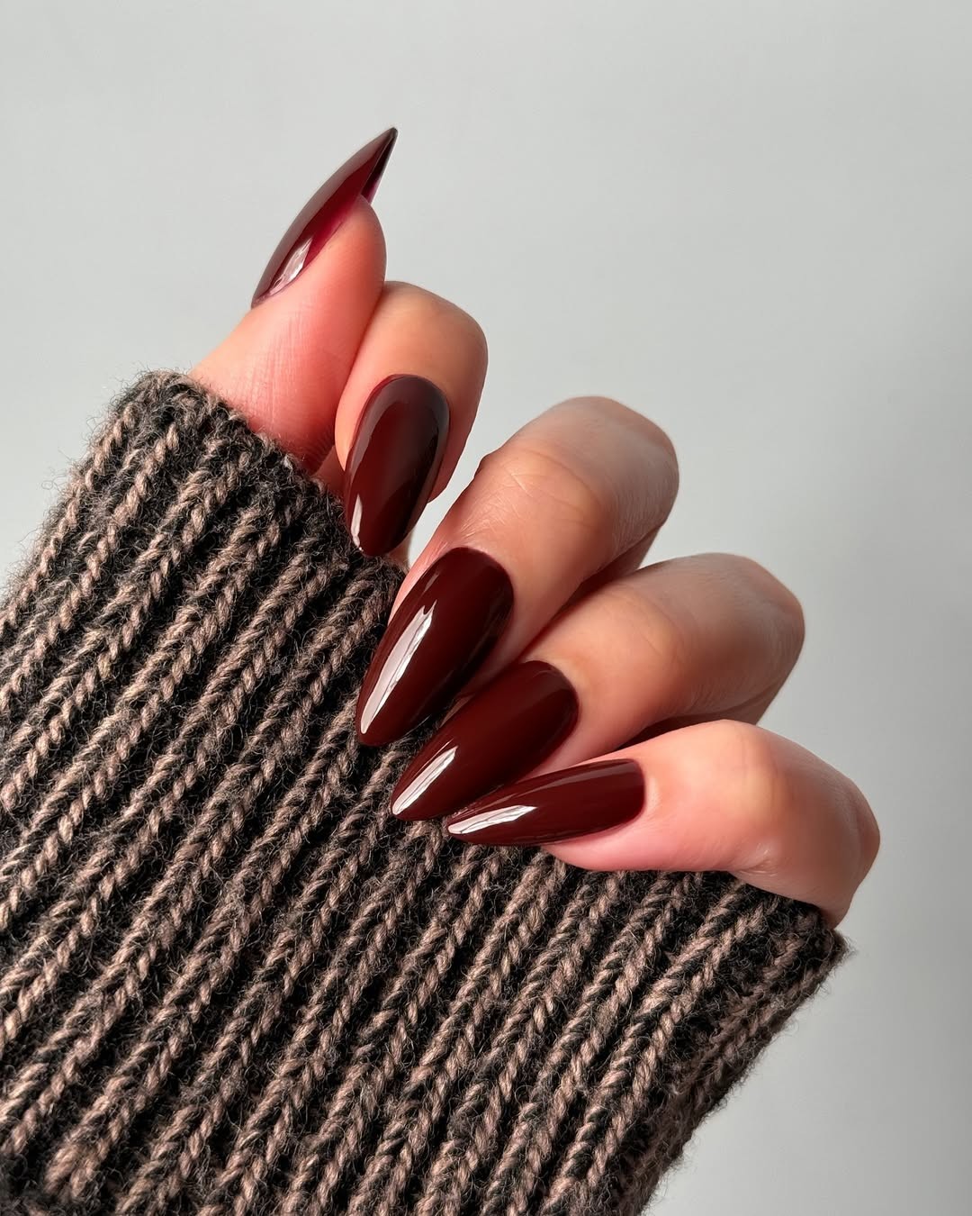 Кафеавата боја е меѓу најпопуларните бои веќе неколку сезони, а сега го најде своето место во светот на маникирите. Кога се комбинира со вечната црвена боја, добивате совршен есенски баланс - боја која е и шик и модерна, но сепак безвременска. Добрата вест е дека cherry mocha изгледа подеднакво добро на кратки и долги нокти и на различни форми, од бадемово до квадратно.