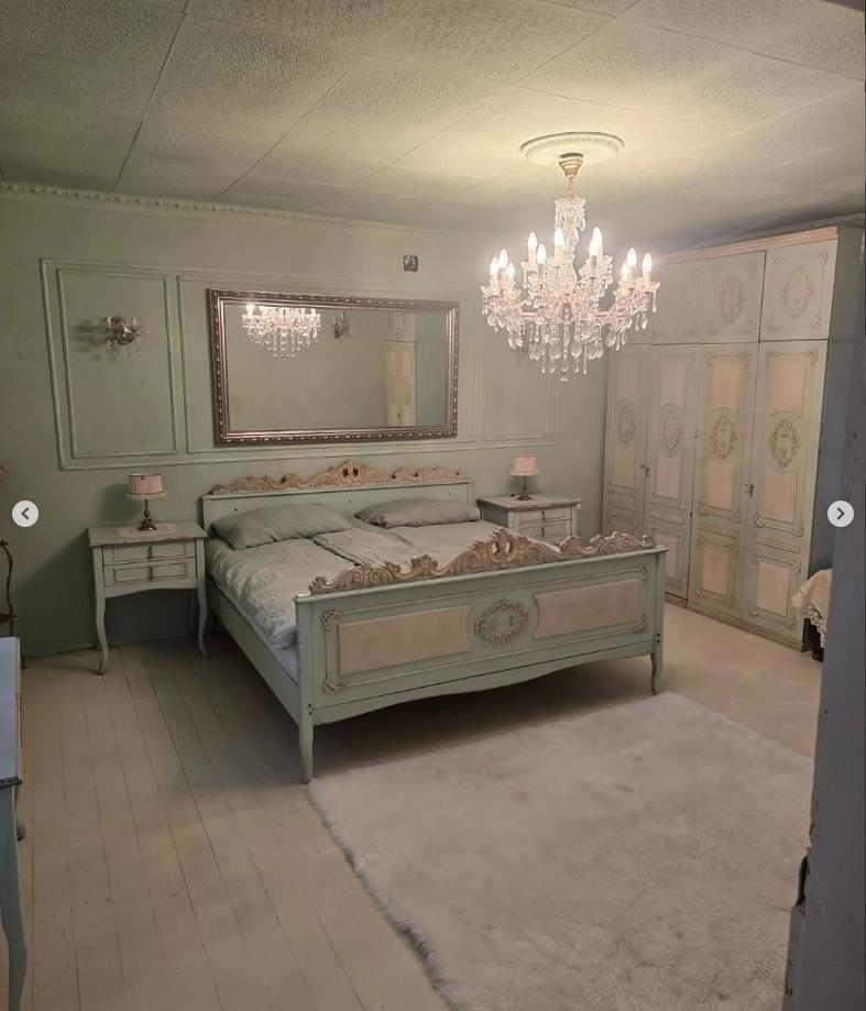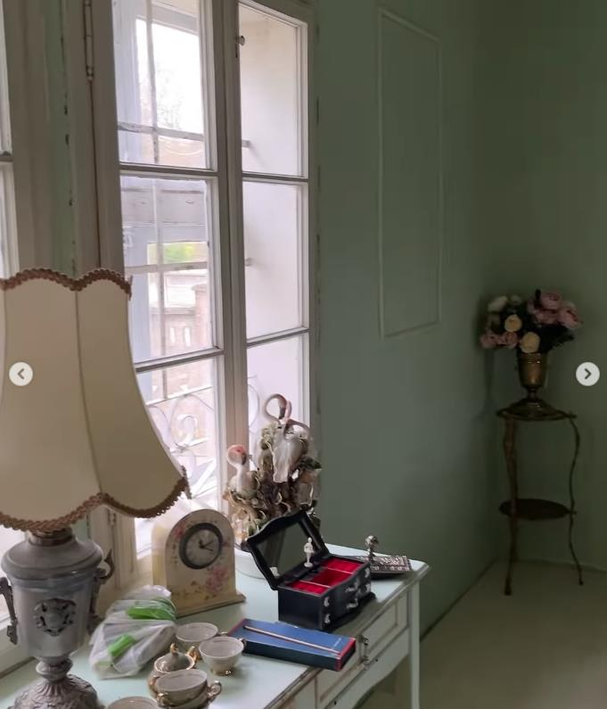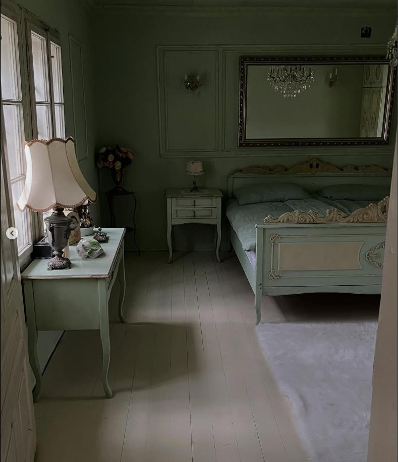 Најголемото задоволство беше спалната соба, која како да излегла од романтичен филм: винтиџ кревет во светло зелена боја, лустер што фрла нежна светлина, античко огледало во златна рамка и ламби со абажури - секој детаљ зрачи со елеганција и топлина на домот. Дури и порцеланските чаши на ноќната масичка станаа заштитен знак на овој ентериер, каде што се среќаваат англискиот шарм и српската душа.