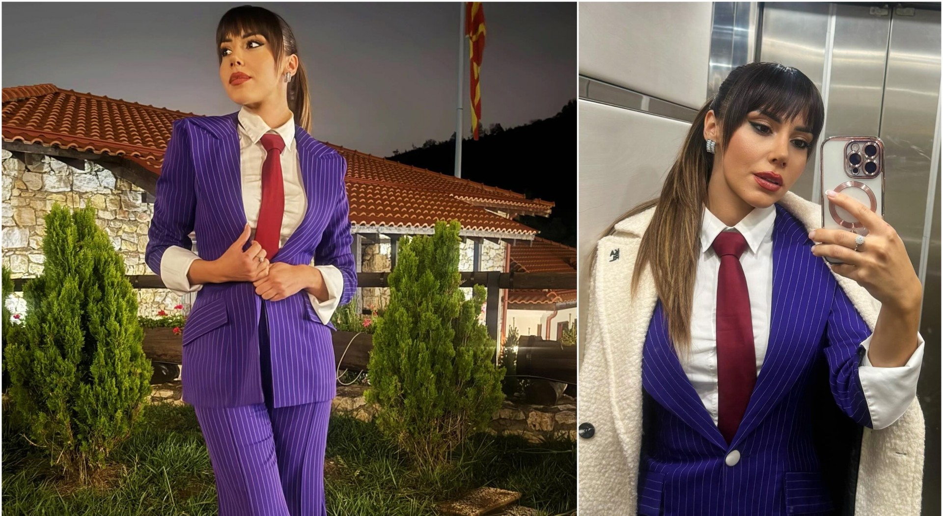 Облечена во впечатливо виолетов костум со тенки бели линии, комбиниран со класична бела кошула и црвена вратоврска, Николова зрачеше со самодоверба и елеганција. Со овој моќен и модерен изглед, таа симболично најави ново поглавје во својата кариера.