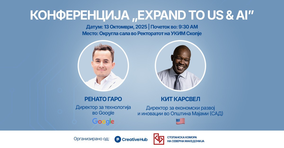 На 13 октомври 2025 година (понеделник), Стопанската комора на Македонија и Creative Hub Академија – македонска компанија со седиште во Мајами, Скопје и Приштина – ќе ја одржат конференцијата “Expand to US & AI”.