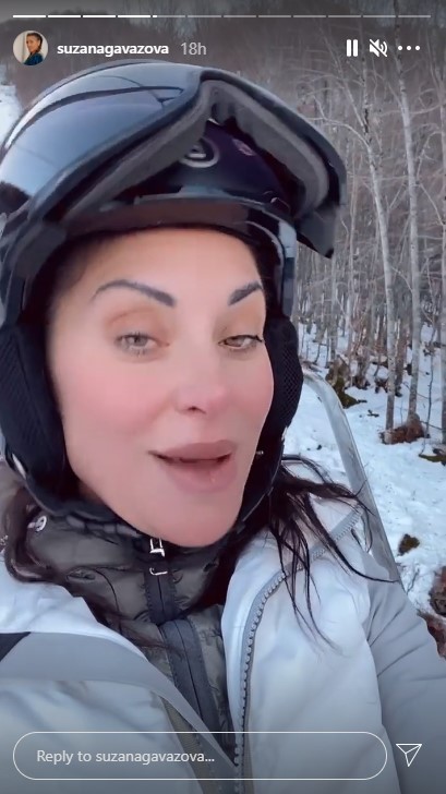На Инстаграм стори стави фотографии на кои се гледа дека е на зимување и ужива во скијачките активности со семејството, а успеа и да се одмори покрај базен, нормално во костим за капење кој ѝ стои совршено.