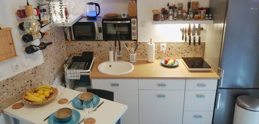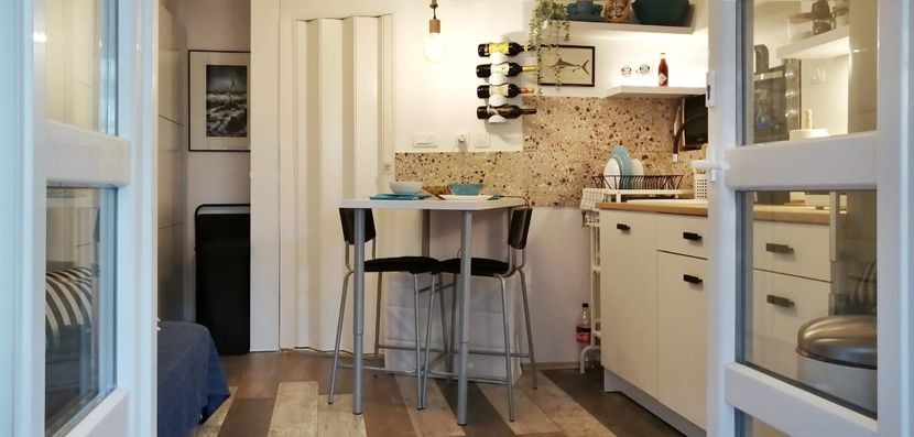 Во реновираната мала просторија за складирање успеаја да „стокмат“ сè, од кујнa до бања, и повторно им остана уште простор за уживање, па дури и мала трпезариска маса.