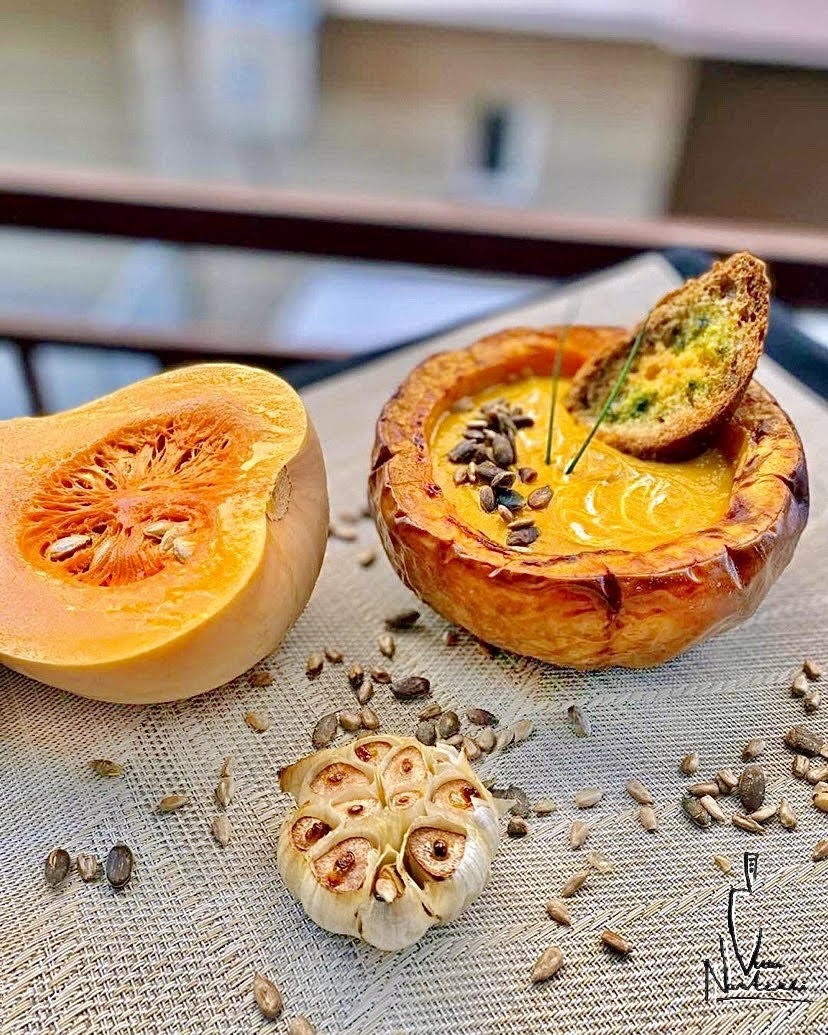 „Супа од тиква, сервирана во цела печена тиква. Визуелно впечатлива, ароматична и совршена за есен.“