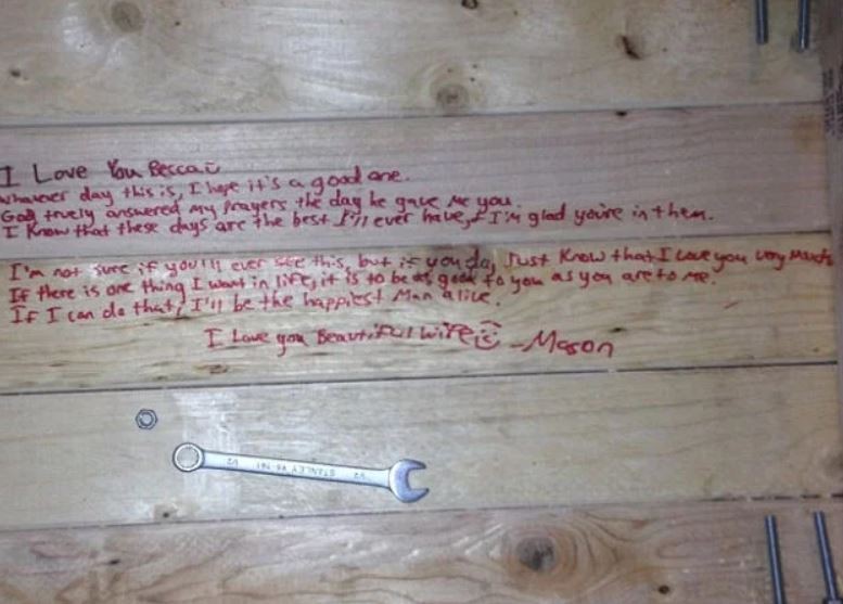„Тој е единствениот и најдобар татко што некогаш сум го имал. Тој ме научи на сè што знае за столаријата. Не сум сретнал некој што е добар како што беше тој“, стои на сликата од масата. Бека сакаше да ја зачува љубовната порака на нејзиниот сопруг, па ја врамени таблата на која беше испишана пораката.