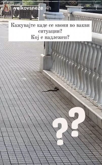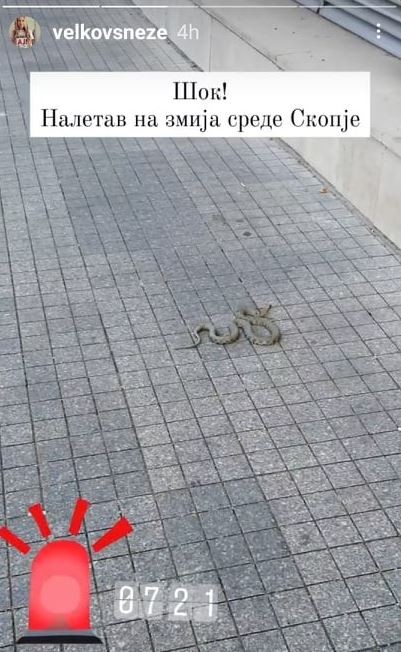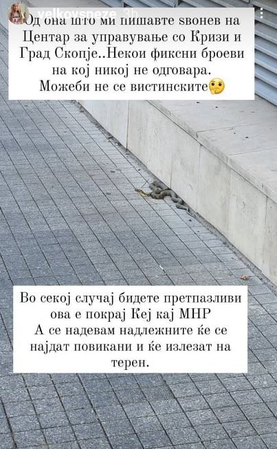 Имено, таа објави видеа на својот Инстаграм профил во кои првенствено покажа змија, која се движи на преграниот асфалт во близина на кејот, кај Минитестерството за надворешни работи.