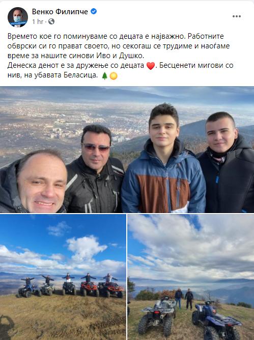 „Времето кое го поминуваме со децата е најважно. Работните обврски си го прават своето, но секогаш се трудиме и наоѓаме време за нашите синови Иво и Душко. Денеска денот е за дружење со нашите деца. Бесценети мигови со нив, на убавата Беласица“,