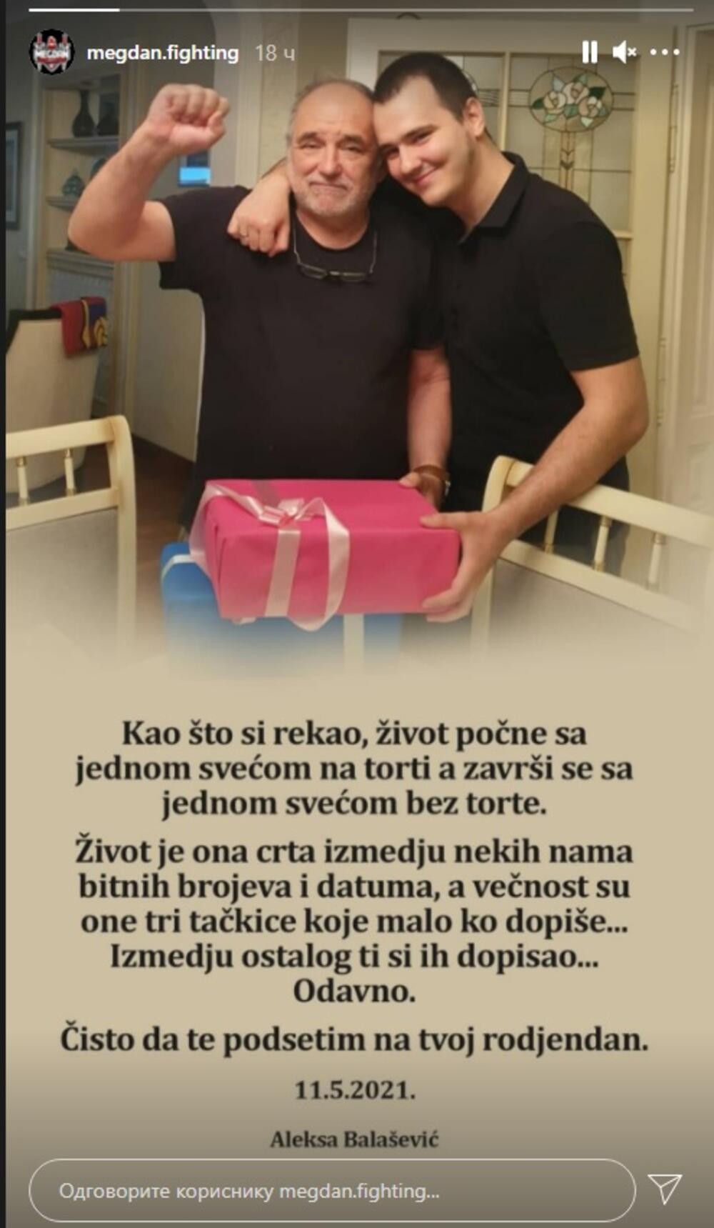 „Како што рече, животот започнува со една свеќа на тортата, а, завршува со една свеќа без торта. Животот е таа линија помеѓу некои броеви и датуми што ни се важни, а вечноста се оние три точки што малку луѓе ги пишуваат ... Меѓу другото, ти ги напиша одамна. Чисто да те потсетам на твојот роденден“, напиша Алекса покрај фотографијата со неговиот татко на која му подарува подарок.